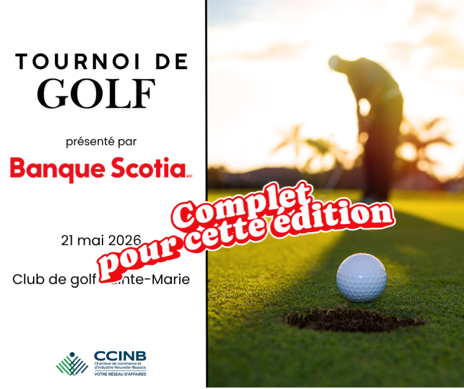 De retour cet été, le Tournoi de golf de la CCINB se tiendra le jeudi 21 mai 2026 au Golf Sainte-Marie. En formule « shotgun en équipes de 6 », le tournoi sera sous la présidence d’honneur de Banque Scotia.